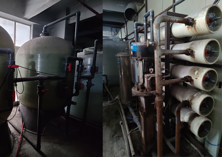 客户需求:老厂房有一套10吨每小时的一级反渗透,机器用了快10年,机器老化,水质不达标,现在出水水质电导率>15μS/cm@25℃,不能满足用水需求,需求重新新购几套双级纯水设备;